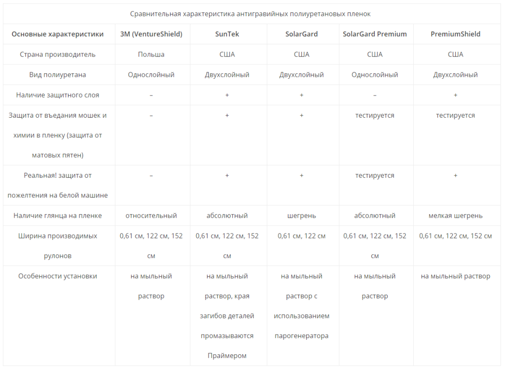 Какая антигравийная пленка лучше, сравнительная таблица характеристик: